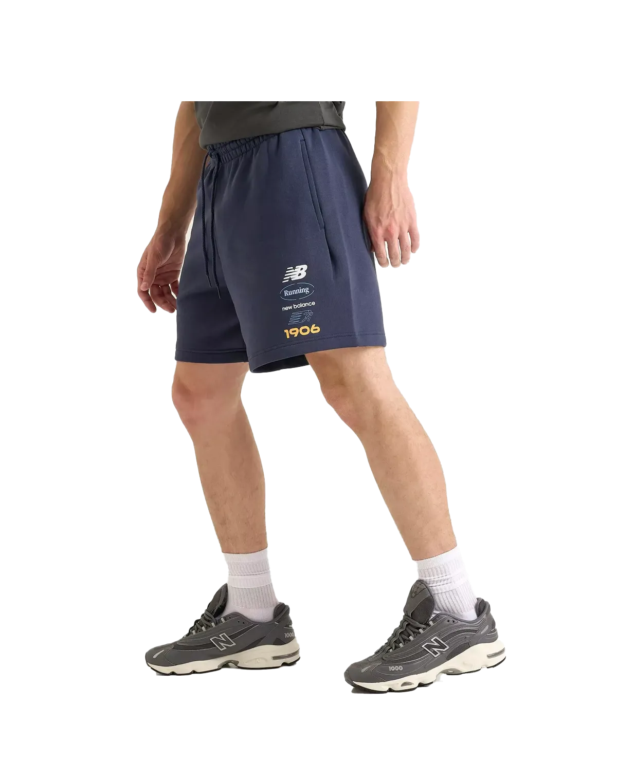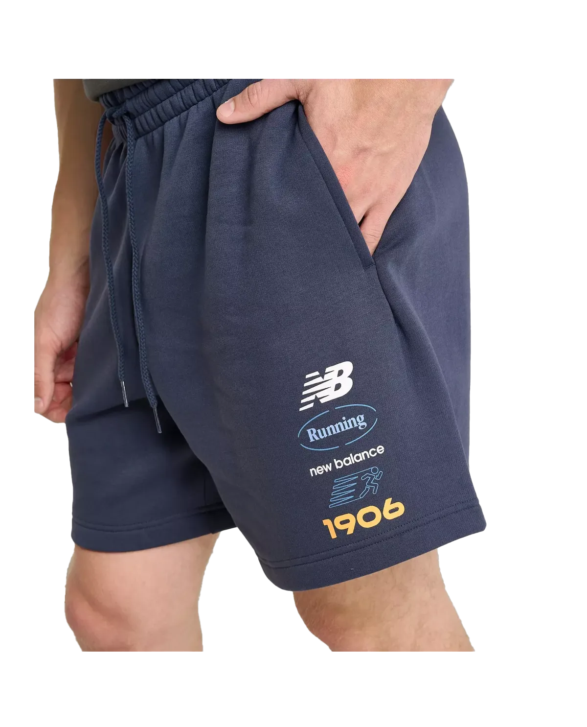 Crafted from a lightweight fleece fabric, these shorts are cut just above the knee and feature a cluster of classic NB graphics above the left hem for an archival athletic aura, essential for daily wear.