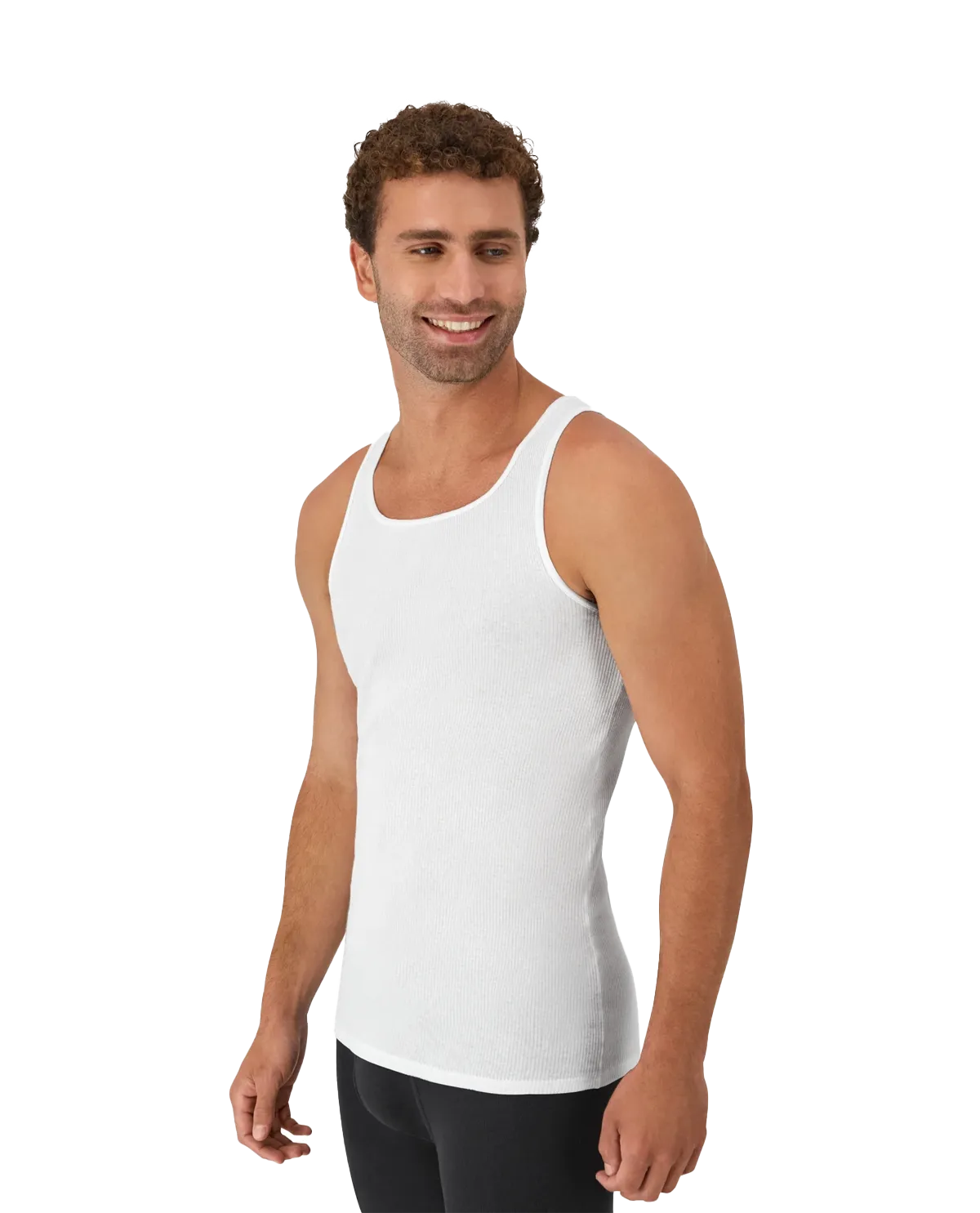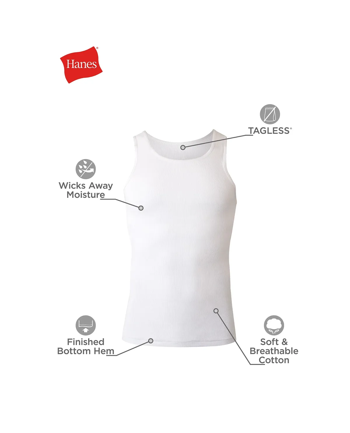 Hanes Men's ComfortSoft white tank undershirts have a banded neck and armholes that resist wear and tear. The 100% cotton fabric is soft, breathable and wicks away moisture. The finished bottom hem looks good worn outside or tucked in. Available in a